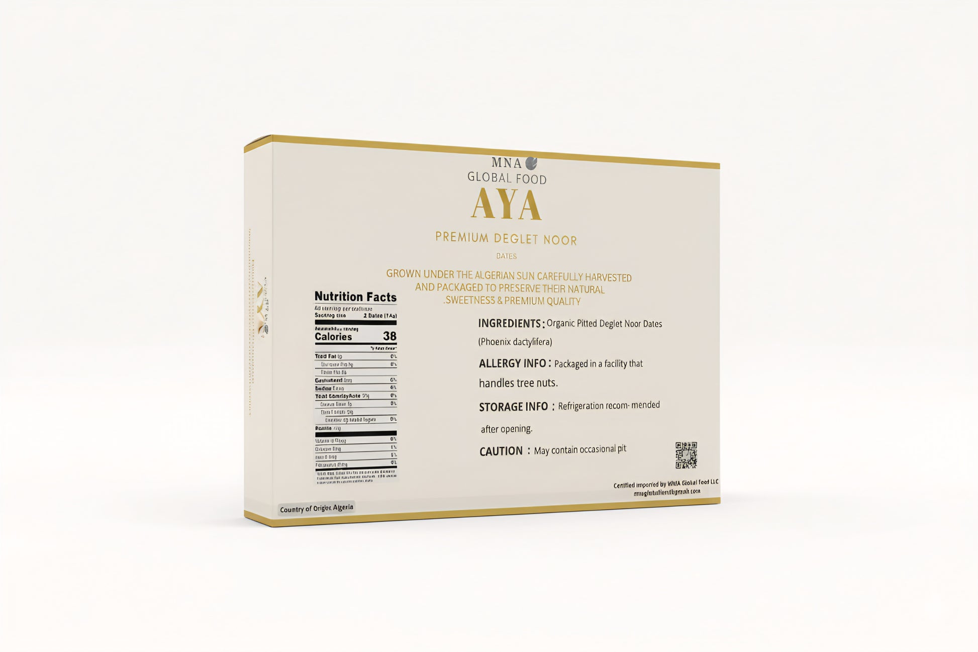 Enjoy AYA Premium Deglet Noor Dates – Soft Algerian Dates, naturally sweet and rich in nutrients. Available in 1.1 lbs (500 g), 2.2 lbs (1 kg) and 4.4 lbs (2 kg) packs. Imported by MNA Global Food LLC (USA).